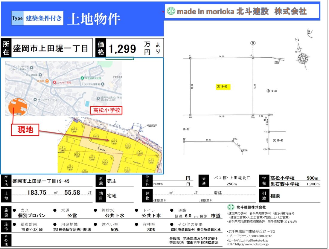 所在地 盛岡市上田堤一丁目19-45 土地面積 183.75㎡ 55.58坪 アクセス 岩手県交通上田堤北口バス停 250ⅿ 販売価格 1,299万円 仲介料 - -