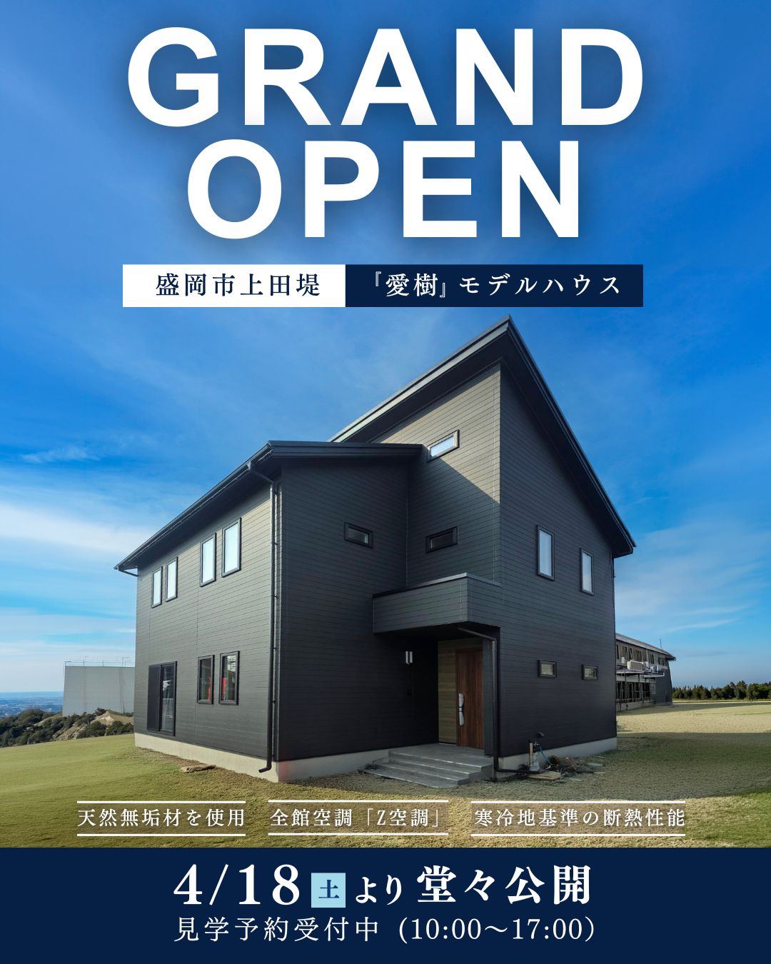 2026.04.09お知らせ モデルハウスOPEN盛岡市上田堤「愛樹」 4月18日土曜日より盛岡市上田堤「イーストタウン高松公園」内にて北斗建設「愛樹」展示場がオープンします。 見学時間 10時~17時定休日 火・水曜日 *駐車場に限りがありますのでご予約をおすすめいたします。 地図 一覧へ戻る
