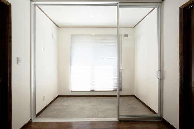 - 和室は格子戸と造作天井に加え左官仕上げと大判タイルでモダンな雰囲気